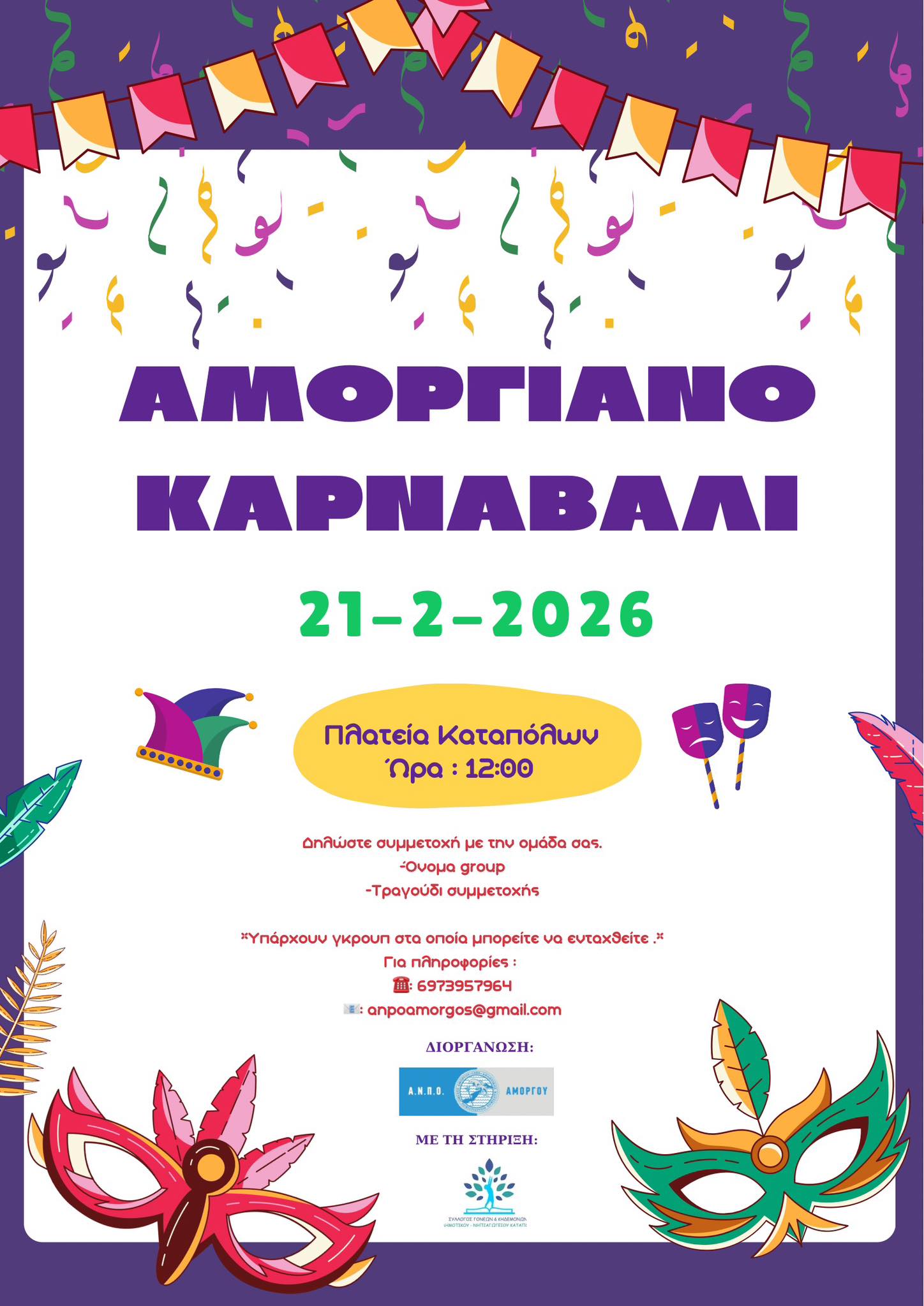 Στις 21 Φεβρουαρίου στην Πλατεία Καταπόλων θα πραγματοποιηθεί το Αμοργιανό Καρναβάλι 2026 τη διοργάνωση του οποίου έχει αναλάβει ο ΑΝΠΟ Αμοργού.