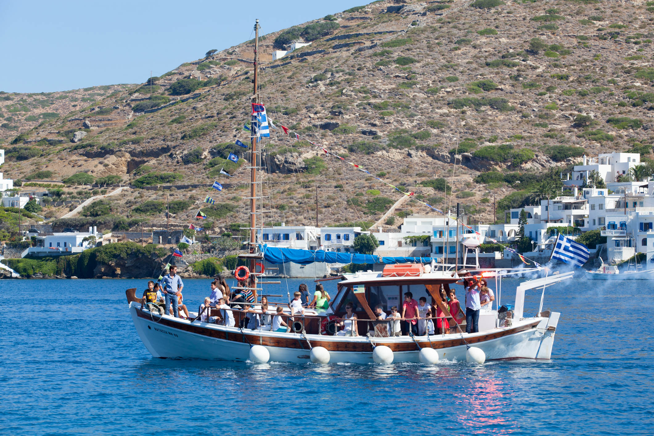 Μετά την λειτουργία ακολουθεί η περιφορά της εικόνας της Παναγίας την οποία συνοδεύουν τα καίκια από τη θάλασσα κορνάροντας και ρίχνοντας καπνογόνα !