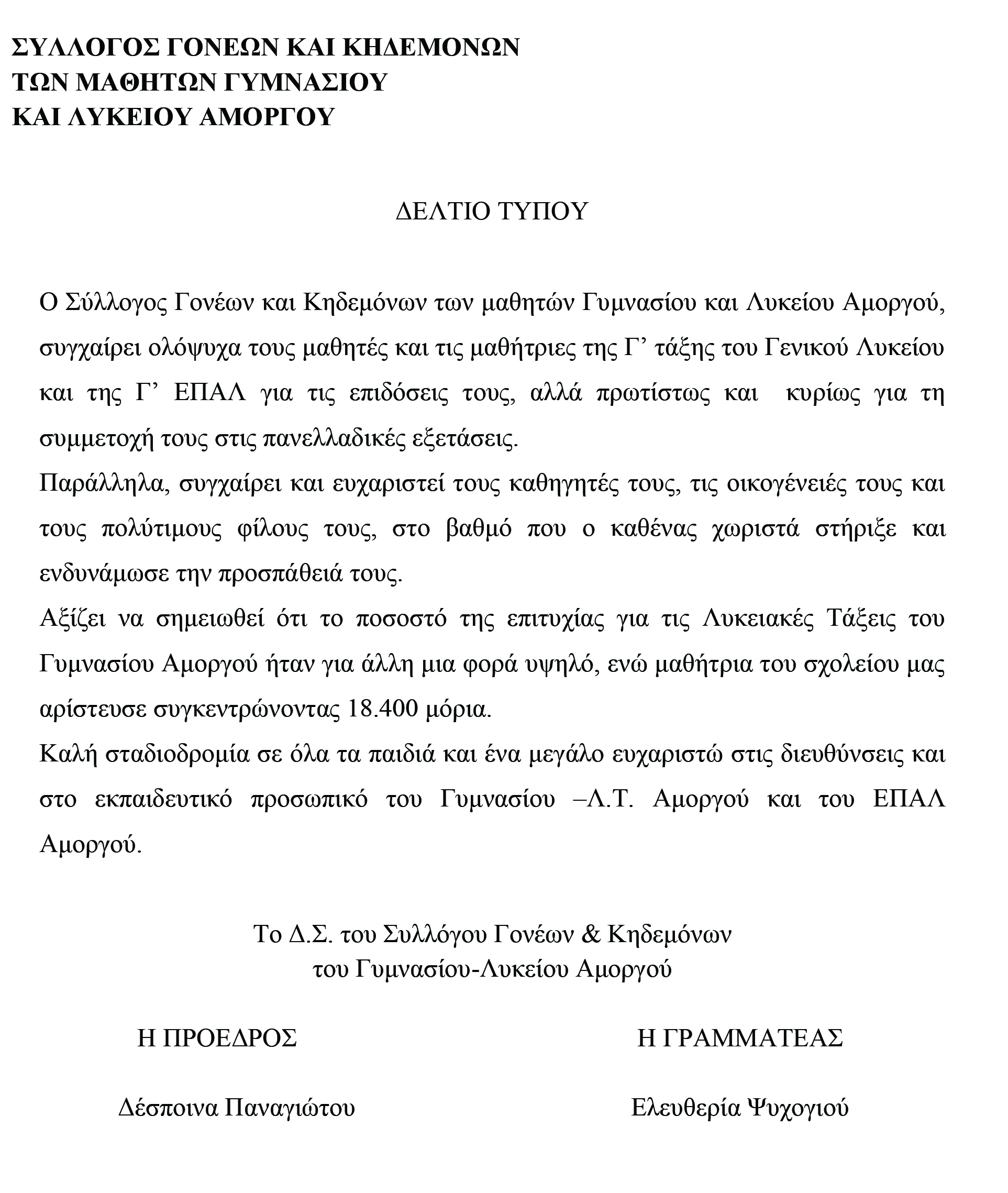 Δελτίο Τύπου Συλλόγου Γονέων & Κηδεμόνων Γυμνασίου-Λυκείου Αμοργού