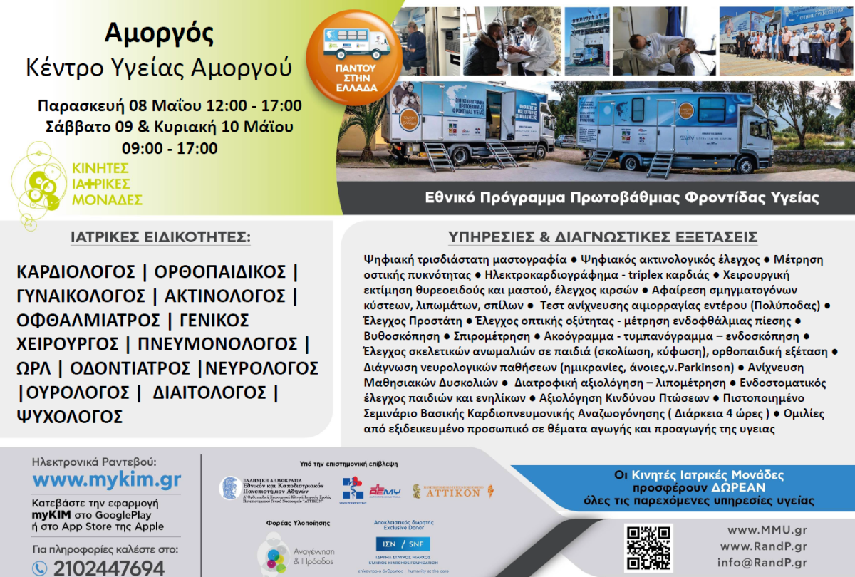 Η επίσκεψη κινητών ιατρικών μονάδων στην Αμοργό θα γίνει το διάστημα 8-10 Μαΐου. Τα ραντεβού γίνονται πλέον MONO ΗΛΕΚΤΡΟΝΙΚΑ.