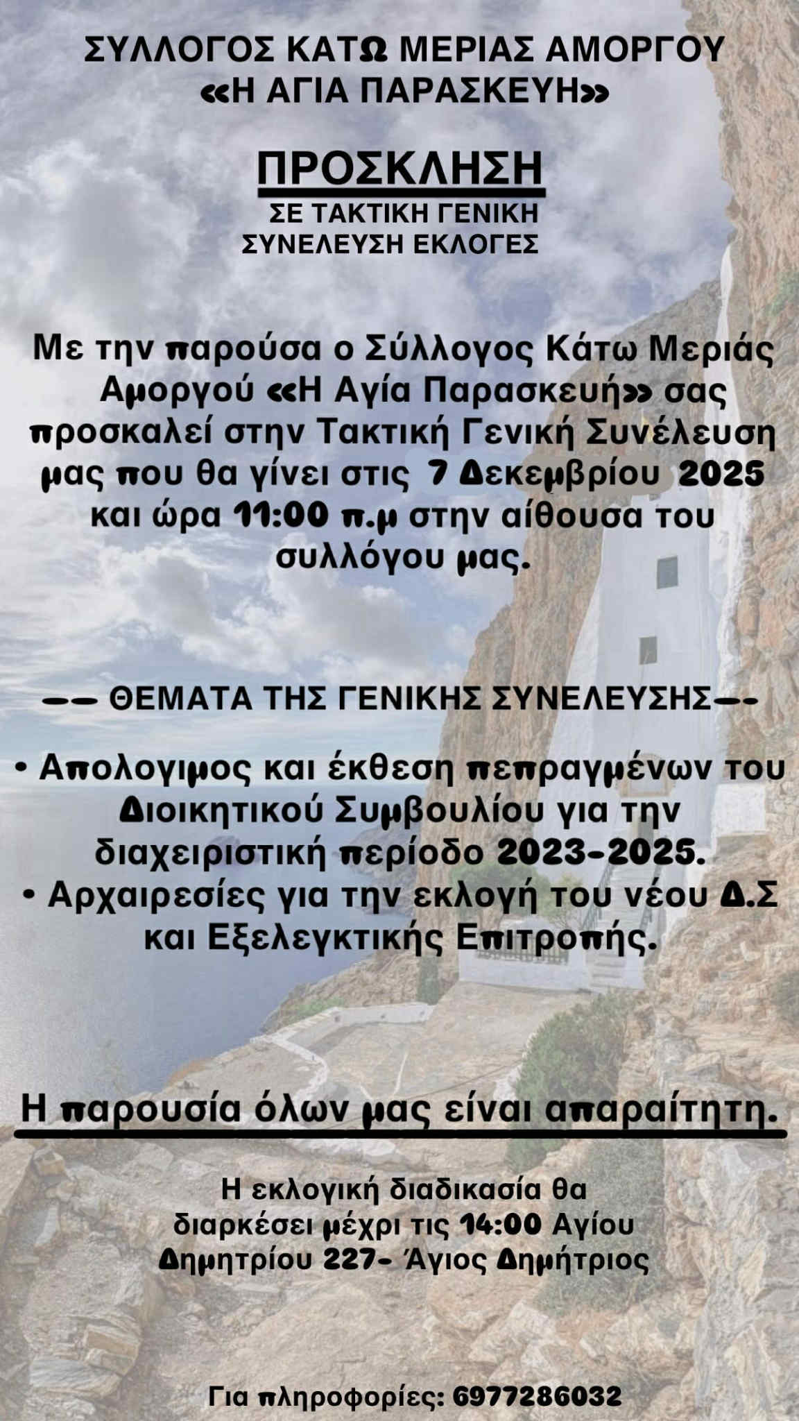 Στις 7 Δεκεμβρίου η Τακτική Γενική Συνέλευση του Συλλόγου Κάτω Μεριάς Αμοργού “Η ΑΓΙΑ ΠΑΡΑΣΚΕΥΗ”