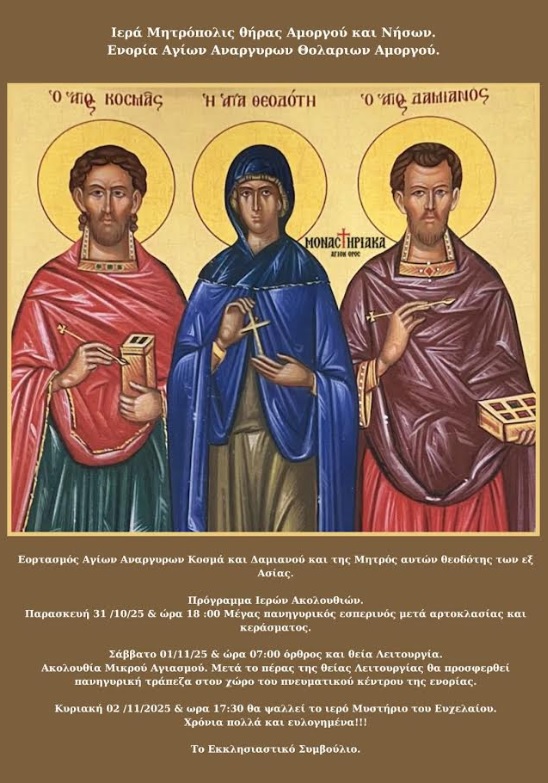 Με λαμπρότητα θα πραγματοποιηθεί και φέτος ο εορτασμός των Αγίων Αναργύρων Κοσμά και Δαμιανού και της μητρός αυτών Θεοδότης των εξ Ασίας.
