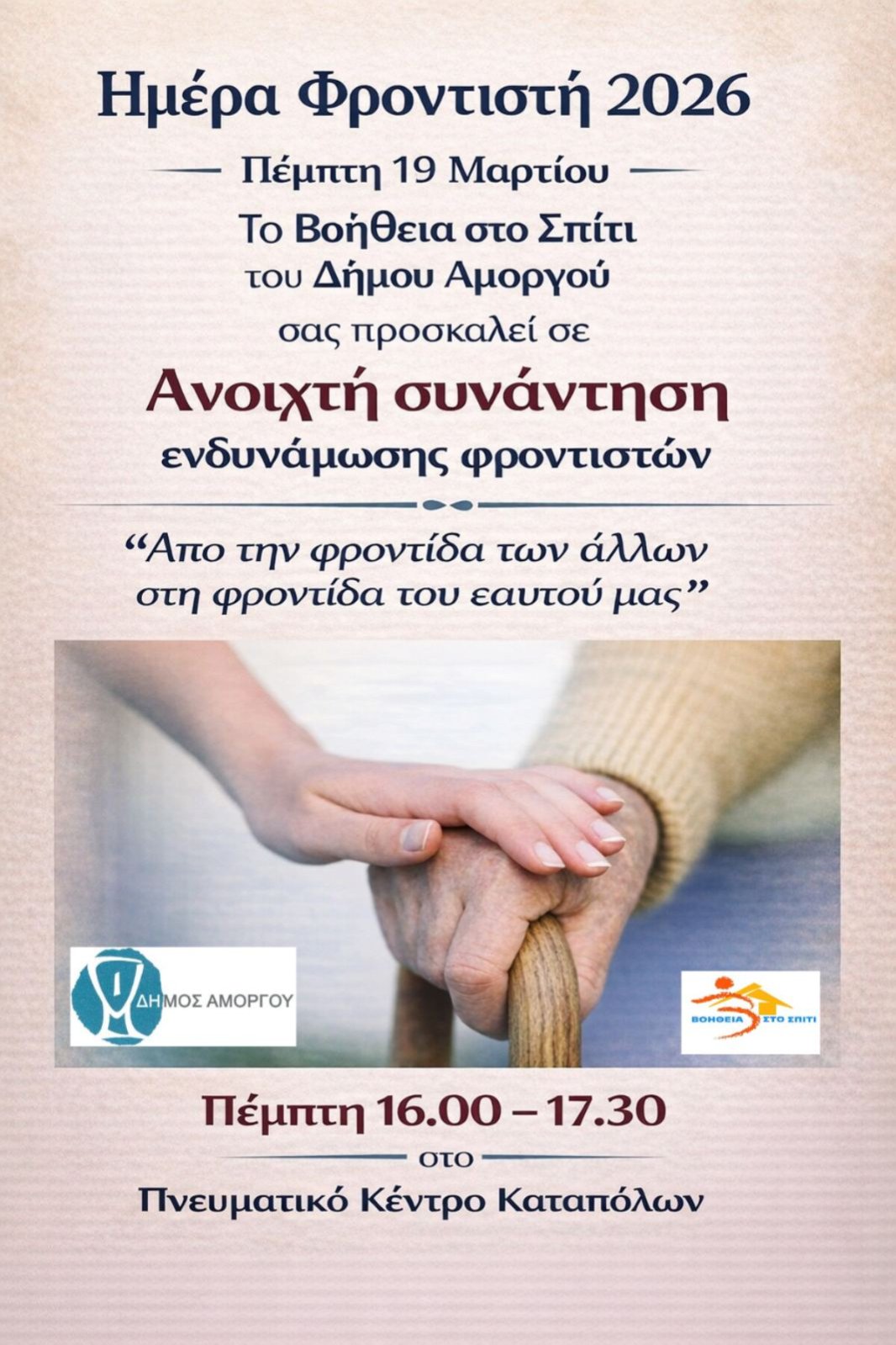 Το “Βοήθεια στο Σπίτι” του Δήμου Αμοργού, τιμώντας την Παγκόσμια Ημέρα Φροντιστών, καλεί τους οικογενειακούς φροντιστές και τα μέλη οικογενειών πασχόντων σε μια ανοιχτή συνάντηση ενδυνάμωσης! Συναντιόμαστε στο Πνευματικό Κέντρο Καταπόλων για να μοιραστούμε εμπειρίες, να συζητήσουμε, να αποφορτιστούμε αλλά και να νιώσουμε πιο δυνατοί, κατανοώντας την αξία της προσφοράς μας.